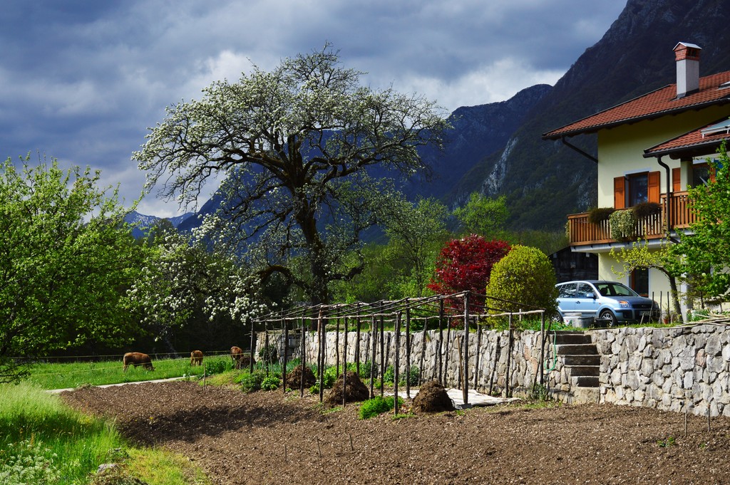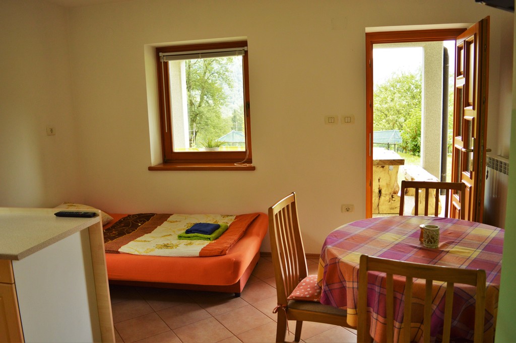 Located in a peaceful sunny village, at the foot of Krasjivrh. Our house lies at the edge of the village Magozd, above the waterfall Kozjak, 7 kilometres from Kobarid. Our apartment is on the ground floor of the house, has own entrance, kitchen, bathroom, bedroom, covered terrace and plenty of outdoor space where you can enjoy your breakfast, grill something delicious on the barbecue, lie in the sun or in the shade. You can let your children to play carefree and listen to yourself or just enjoy and be one with nature.